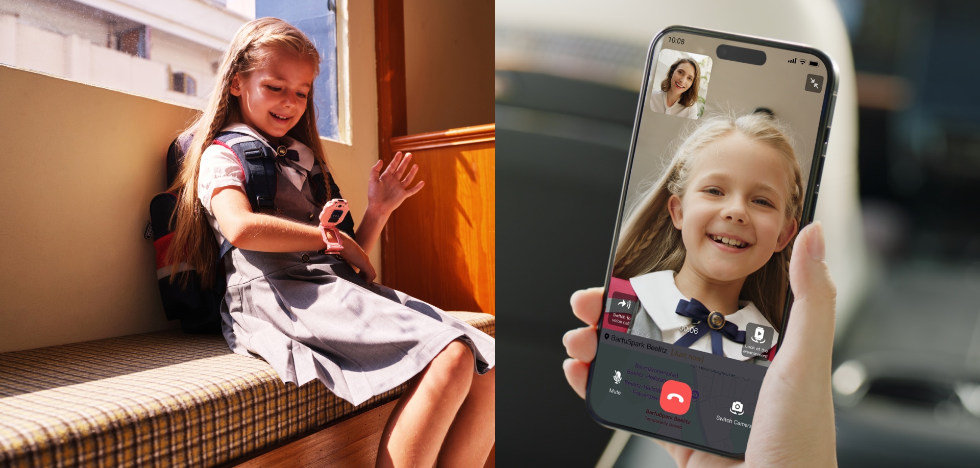 During a video call with your child, you can simultaneously view the child's face through the front camera and the surrounding environment through the rear camera.
